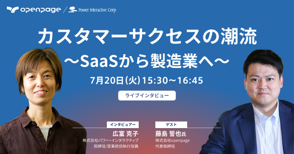 株式会社パワー・インタラクティブは、SaaSベンダーから製造業へと広がりつつあるカスタマーサクセスをテーマに、株式会社openpageの藤島様をゲストにお迎えした無料ウェビナー『カスタマーサクセスの潮流 ~SaaSから製造業へ~』(参加無料)を、7月20日に開催します。