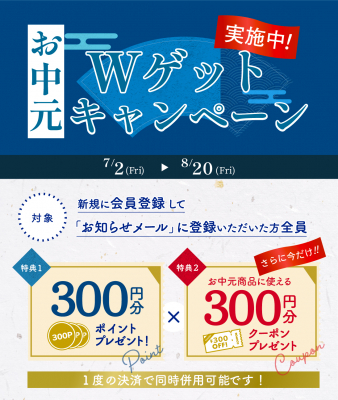 当キャンペーンは、「九州お取り寄せ本舗」に新規会員登録し「お知らせメール」に登録いただいた方全員に、300円分のポイントに加え、お中元商品に使える300円分のクーポンをプレゼントするというものです。キャンペーン期間は、7月2日(金)~8月20日(金)まで。合計600円分の割引は今だけの特典となり、一度の決済で同時併用可能となっております。詳細は、以下でご確認ください。