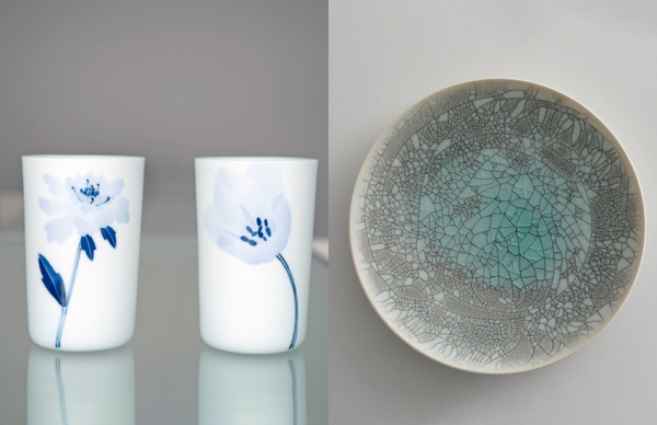 「潤い」をコンセプトに生み出される器は、ガラスのような涼しげな釉薬と表面の貫入の表情が印象的で、きらめる水面を連想させます。磁器ならではの軽やかさを出す為に、ろくろを引いた後にさらにかんなで薄く削りシャープさを際立たせながら成形されています。