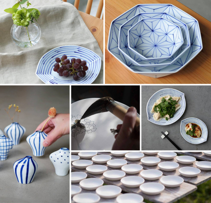 透明感があり柔らかな風合いの白い素地と、写実的で繊細さが魅力の染付である瀬戸染付焼。呉須による藍の発色は、素地・釉薬・焼き方によって窯元ごと異なりますが、潤いをもったブルーは眞窯の特徴の一つとなっています。また、通常2回施す焼成を3~4回繰り返す眞窯の作品は、濃淡の表情が豊かに表れ、白字に青が一層鮮やかに映えています。また加藤真雪さんは、伝統的な瀬戸染付焼をさらに独自に発展させ、青だけでなく、金や赤などの色を取り入れた特徴的なデザインは、伝統柄にはない斬新な印象を与えています。