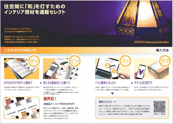 業界初の全製品二次元バーコード付き和風金物・資材の通販カタログ。スマホのカメラを使ってバーコードを読み取ると、対象商品の詳細データや詳細図面等を見ることができます(※3)。ビドーパル会員(※1)の方はログイン後に会員価格が表示されます。今回発行するカタログには、ユーザー様がご注文される際の必要最低限の情報の記載はありますが、図表(商品の数値データや商品図面)の記載はありません。その代わりに二次元バーコードが全商品に配置されています(業界初の試み)。これにより印刷カタログの特性である閲覧性(ページをめくりながら目的の商品を素早く探す性質)はそのままに、気になる商品の詳細情報をスマホで確認することができます(※3)。