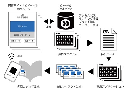 具体的には、商品データベースから出力した掲載用 CSV データをアプリケーションに入力すると、商品名、商品画像、商品アイコン、QR コード等、カタログ内に表示されているほぼすべての商品に関する情報を取得し、自動でレイアウトされるという新しい技術を取り入れています。