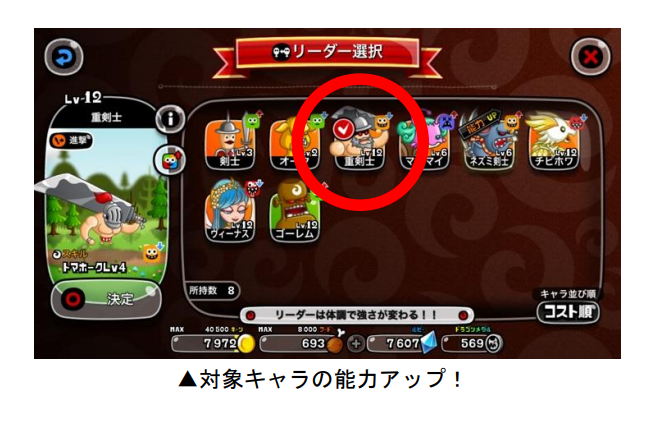 「リーグ」で行われるすべてのバトルを対象に、特定のキャラをリーダーにすると能力値(攻撃・防御・HP)やスキル発動率がアップします。