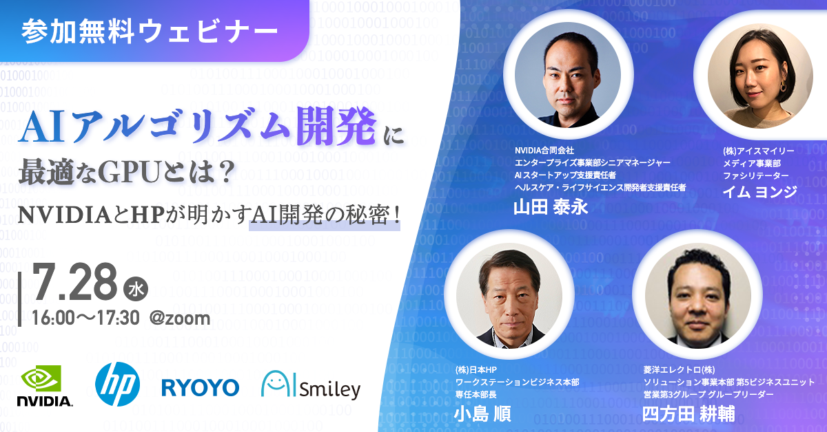 人工知能を搭載したサービスの資料請求ができるAIポータルメディア「AIsmiley」を運営するアイスマイリー(東京都渋谷区、代表取締役:板羽晃司)は、7月28日(水)16時から、NVIDIAとHPが明かすAIアルゴリズム開発の秘密をテーマにウェビナーを開催いたします。