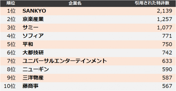 集計の結果、2020年に最も引用された企業は、1位 SANKYO、2位 京楽産業、3位 サミーとなりました。