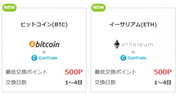 今回、CoinTradeとのポイント交換により、1モッピーポイントを1円として500 P(ポイント)からCoinTradeで暗号資産に交換してご活用いただけます。また、CoinTradeの暗号資産交換対象の第一弾として、ビットコイン(BTC)とイーサリアム(ETH)に交換が可能となります。
