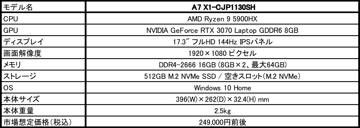 A7 X1-CJP1130SHは、CPUにベースクロック3.3GHz、ブースト時最大4.6GHz動作を実現する8コア/16スレッドのAMD Ryzen 9 5900HXを採用し、GPUにNVIDIA GeForce RTX 3070 Laptop GPUを搭載した17.3型ゲーミングノートPCです。