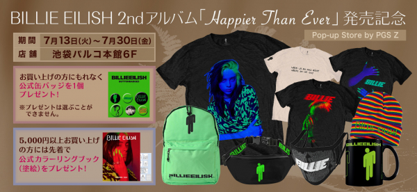 日本最大のRock&Entertainment公式グッズ・ストアPGSを運営する株式会社JAMSHOPPINGは、Billie Eilish 2ndアルバム『Happier Than Ever(ハピアー・ザン・エヴァー)』7月30日発売を記念して、世界の新商品を含む選りすぐりの公式商品を取り揃え7月13日(火)~30日(金)までオープンいたします。
