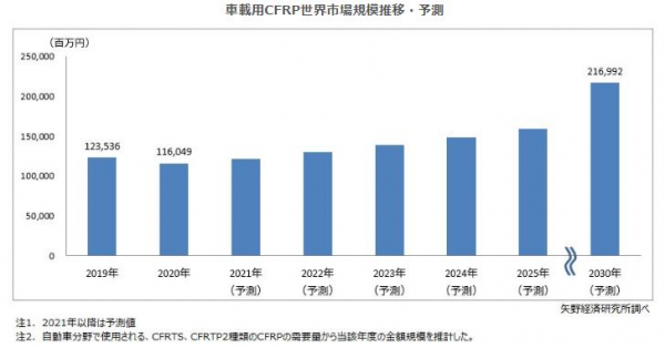 株式会社矢野経済研究所(代表取締役社長:水越孝)は、車載用CFRPの世界市場を調査し、成形法別、エリア別、採用部位別の動向、参入企業動向、将来展望を明らかにいたしました。