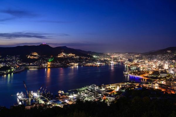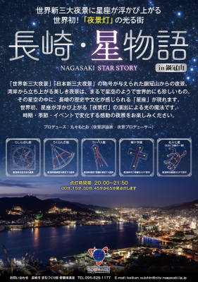 (一社)夜景観光コンベンション・ビューロー(代表理事・丸々もとお)では、長崎市における新たな夜景創出の一環として、史上初の照明演出を用いた「長崎・星物語 in鍋冠山」をプロデュースしました。同演出は「世界新三大夜景」「日本新三大夜景」に認定された長崎夜景の磨き上げを目的に、弊社代表理事・丸々もとおが5年以上の歳月をかけて考案した新照明「夜景灯※」を活用した演出です。“鶴の港”と呼ばれる長崎港からすり鉢状の地形に立ち上がる夜景はまるで星空のようで、その夜景の中に長崎の歴史や文化が感じられる「星座」等の形態が出現し、季節やイベントによって変化する感動のシーンがお楽しみいただけます。今回は2020年に初登場した稲佐山演出に続く第二弾企画で、2021年7月15日(木)より点灯開始となりました。