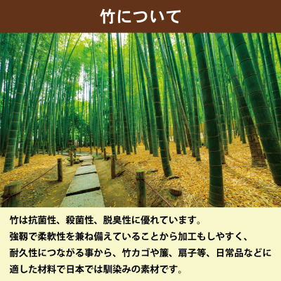 竹は抗菌性、殺菌性、脱臭性に優れています。強靭で柔軟性を兼ね備えていることから加工もしやすく、耐久性につながることから、竹かごや、籠、扇子等、日用品などに適した素材で日本では馴染みの素材です。