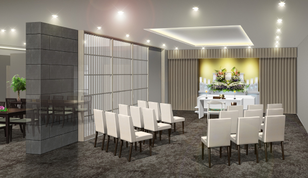 落ち着いたグレイッシュカラーに、アースカラーを随所に取り入れた外装が特徴で、レンガ調の明るいタイルと木調ルーバーを配した車寄せにより、プライベートを重視したお見送りをすることができます。外装と統一感のあるグレイッシュカラーを中心にコーディネートされたホール内は、壁による仕切りを極力なくしたレイアウトで、和室二間続きでの利用も可能なご家族の控室など、くつろぎの空間を提供します。また、ホール内からガラス越しに見ることができる植栽が映える景観が、ご家族や参列者に安らぎを与えてくれます。