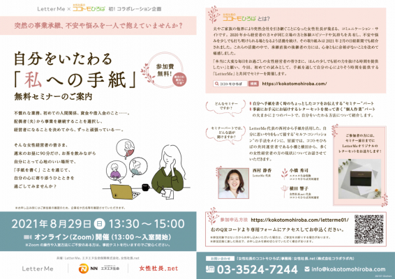 ・セミナー名:「~LetterMe × 女性社長のココトモひろば 初!コラボレーション企画~自分をいたわる「私への手紙」無料セミナー」