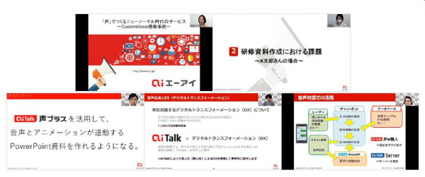 「AITalk(R)WebAPI」の連携により、既存の自社クラウドサービスへナレーション作成・挿入機能をオプションとして搭載されているお客様の事例や、チャットボットとの連携による音声対話としての利用事例をご紹介いたしました。