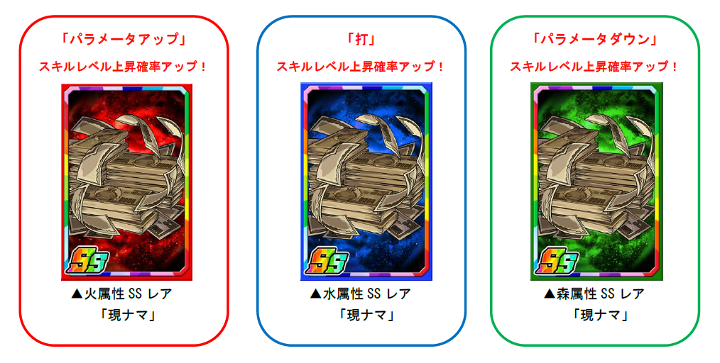 限定強化素材「現ナマ」は一部のモンスターに使うと強化値2倍の効果があるほか、パラメータアップ・打・パラメータダウンのスキルレベル上昇確率もアップします。