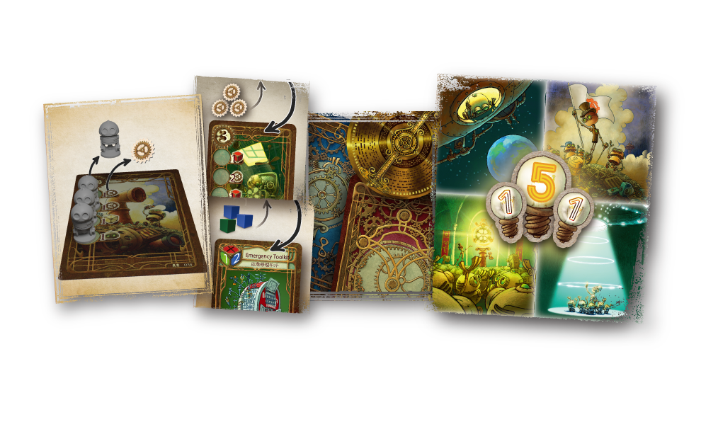 内容物/カード72枚(59x92mm)、レコードタイル20枚、ワーカー50個、ペレット80個、ギアトークン80個、勝利点トークン80枚、+1資源トークン1枚、-1ギアトークン1枚、サマリータイル4枚、スタートプレイヤーマーカー1個、ルールブック2冊(日・英)