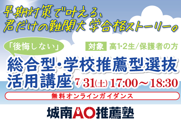 2021年7月31日(土)、株式会社城南進学研究社(所在地:神奈川県川崎市、代表取締役社長CEO:下村勝己)が運営する総合型・学校推薦型選抜対策専門予備校「城南AO推薦塾」(塾長:川原洋孝)は、無料オンラインガイダンス「高1・2生対象 総合型・学校推薦型選抜 活用講座」を開催いたします。