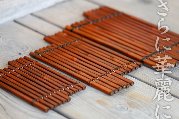 染花台は稈の太さが均一で真っ直ぐな女竹を使って仕立て上げました。赤染した色合いが花籠を華やかに引き立てます。床の間や玄関でぜひ竹花篭と合わせてお楽しみいただきたい逸品です。