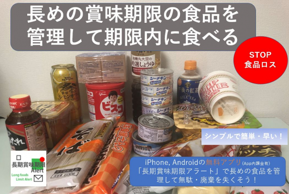 なお、「長期賞味期限アラート」は、iPhoneの「AppStore」,Androidの「Google Play」で「長期賞味期限アラート」と検索することでインストール可能です。