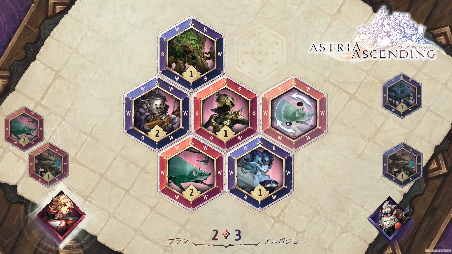 『アストリア アセンディング』のゲーム内で遊べるミニゲーム「J-Ster(Jスター)」は、六角形をしたトークンを使ってNPCたちと対戦し、勝利するとトークンを手に入れてコレクションに加えていくことができるカードゲームのようなモードです。またメインモードの戦闘中に、J-Sterの名人「アルパジョ」の特殊攻撃で、敵をトークンに取り込むこともできます。
