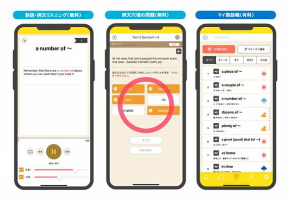 テスト機能での正解/不正解のデータを蓄積し、自分の苦手な熟語だけを集中的に学習できます。音声を聞いて答える問題形式や、問題の選択肢を隠せる機能なども新たに追加され、徹底した復習や暗記モレのチェックが可能となります。