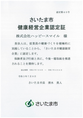 写真代行販売サービス「みんなのおもいで.com」を提供する株式会社ハッピースマイル(本社:埼玉県さいたま市西区 代表取締役社長兼CEO:佐藤堅一)は、2021年7月9日、従業員の健康課題の把握と必要な対策が認められ、『さいたま市健康経営企業』として認定されました。