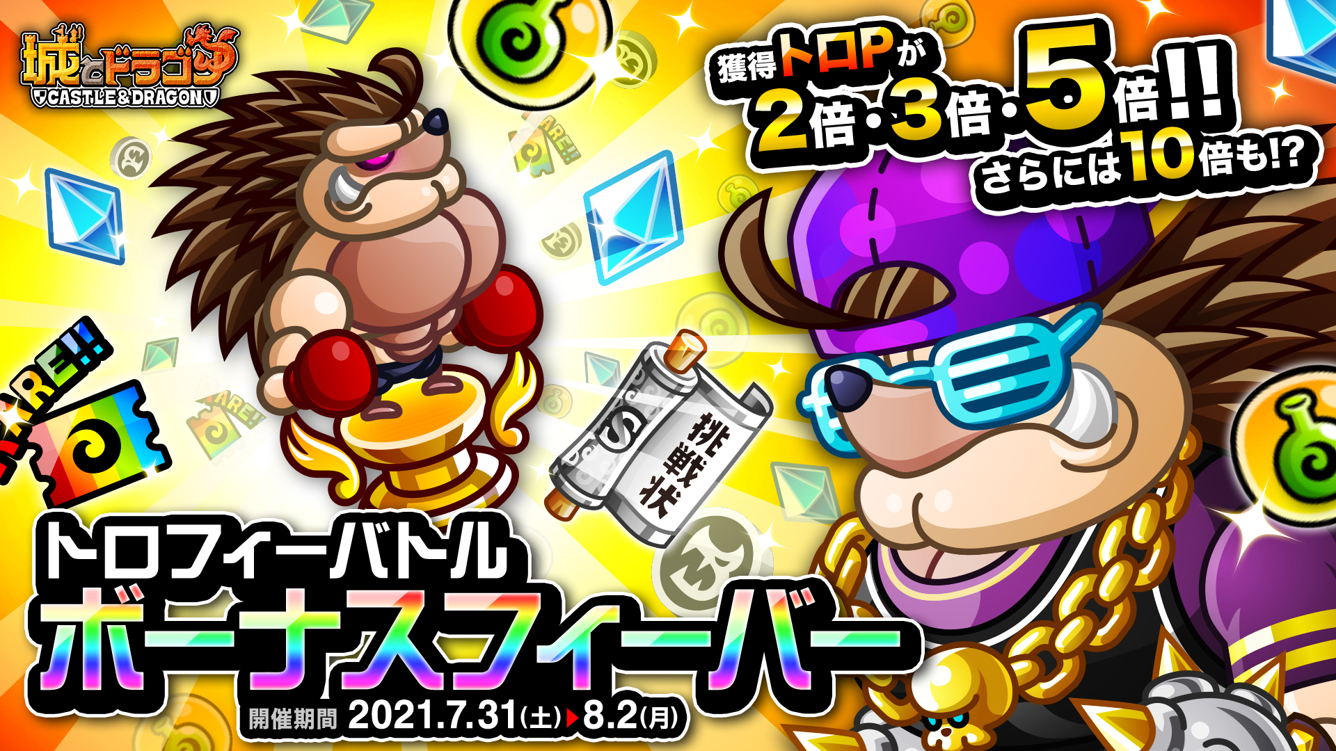 上記期間中、すべてのトロフィーバトルを対象に、バトル終了時に獲得できるトロPが“2倍/3倍/5倍/10倍”のいずれかになります。