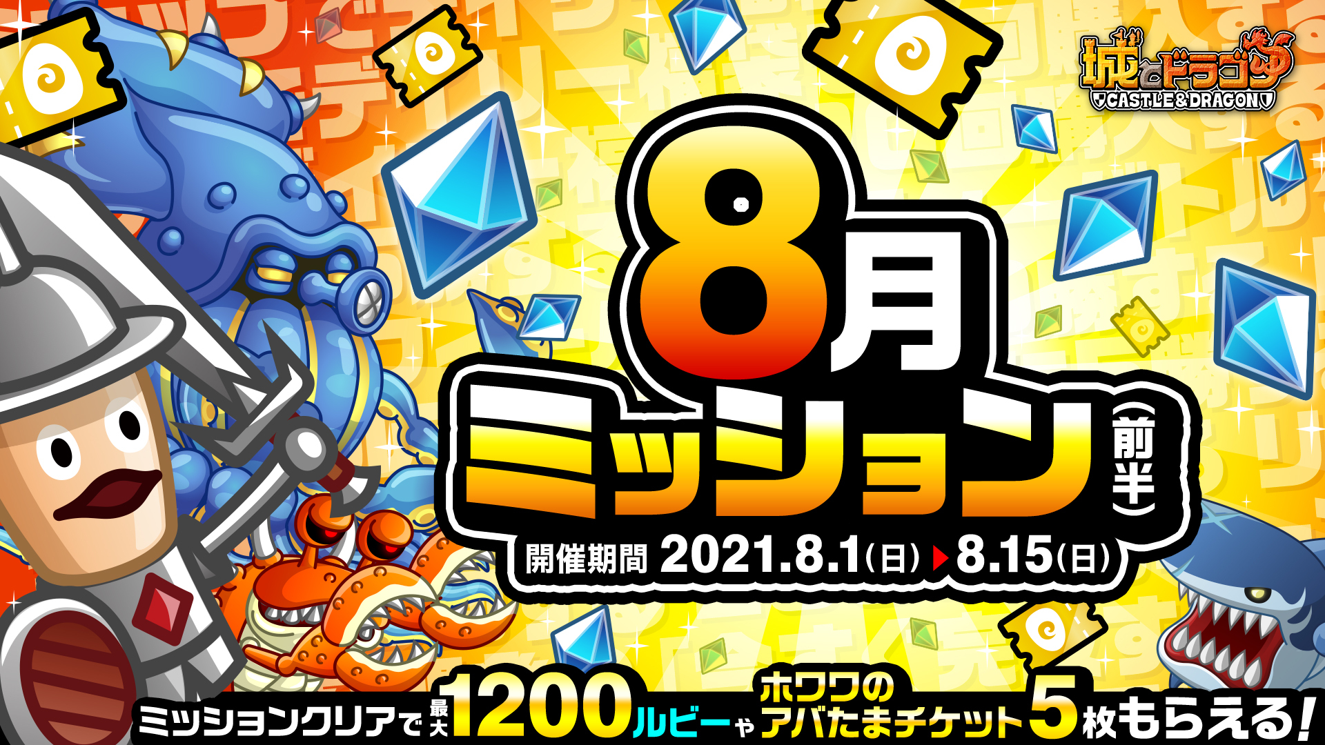 7月31日(土)より、最大で1000ルビーや1000CPなどがもらえる「夏休みログインボーナス(前半)」を開催いたします。また、8月1日(日)よりミッションクリアで最高1200ルビーなどがもらえる「8月ミッション(前半)」も開催。