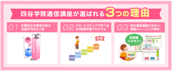 四谷学院通信講座では、毎年たくさんの合格者を輩出しています。予備校「四谷学院」という母体を持ち、学ぶことや試験対策長年にわたって研究している四谷学院だからこその合格のための秘訣がぎっしり詰まっています。勉強にブランクがあっても心配いりません。忙しい方でも大丈夫。1年以内での合格が四谷学院のモットーです。