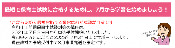 ※令和4年前期保育士試験対策の講座は、7月29日から申込受付開始いたしました。今お申込みいただくと2023年7月31日までサポート、現在教材の予約受付中で8月末頃発送を予定しております。