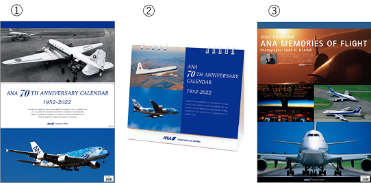 2022年に創立70周年を迎えるANAからお客様への感謝の気持ちを込めて、創業期から現在までのANA機を辿る「ANA 70TH ANNIVERSARYカレンダー」(壁掛・卓上)や、長年ANA機の雄姿を撮影しているルーク・オザワ氏がセレクトした「ANA MEMORIES OF FLIGHTカレンダー」(壁掛)は、70周年の節目にふさわしいカレンダーとなりました。