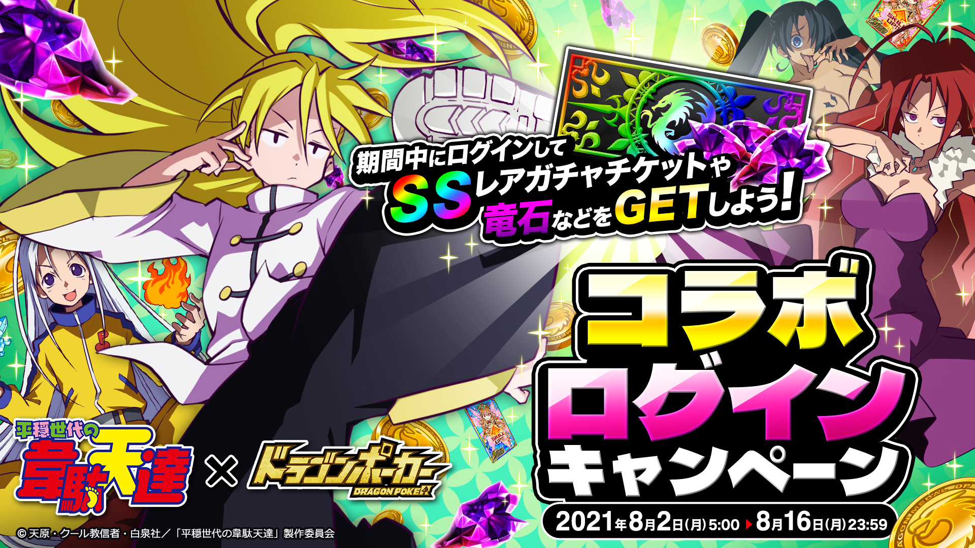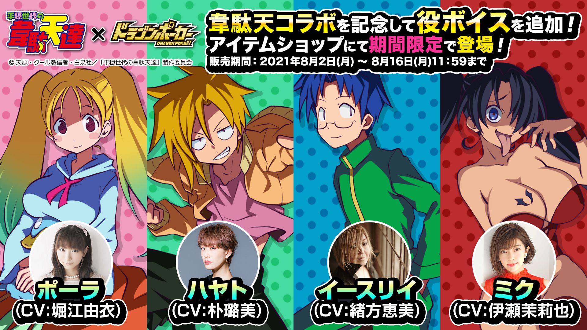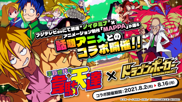 株式会社アソビズム(本社:東京都千代田区、代表取締役:大手智之)は、App Store・Google Playにて好評配信中のリアルタイム合体カードバトル『ドラゴンポーカー』で、2021年8 月2日(月)よりTVアニメ『平穏世代の韋駄天達』とのコラボイベントを開催いたします。
