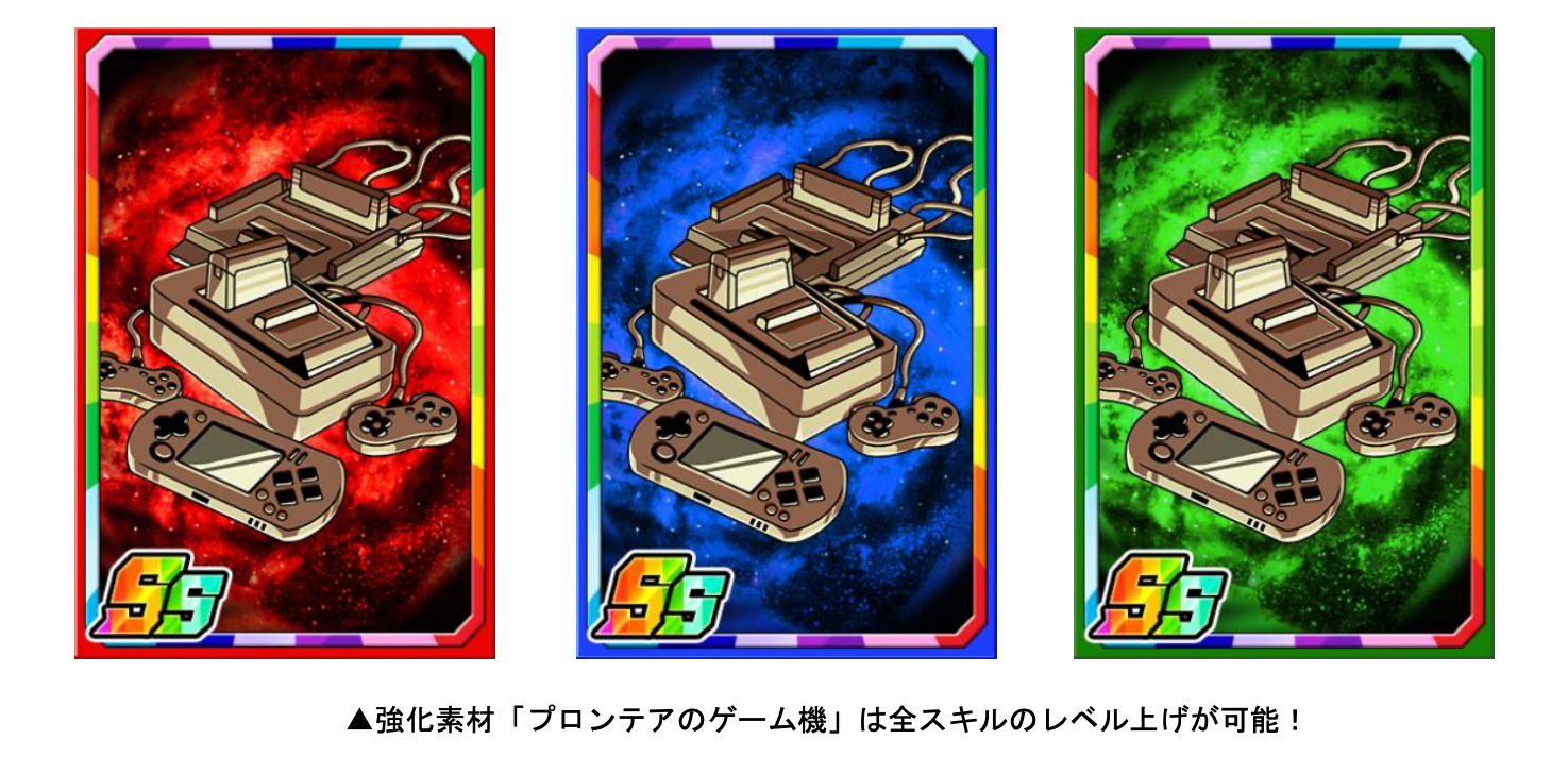 「韋駄天P」を使い、ポイント交換、または素材ガチャを回すと限定強化素材「プロンテアのゲーム機」を手に入れることができます。