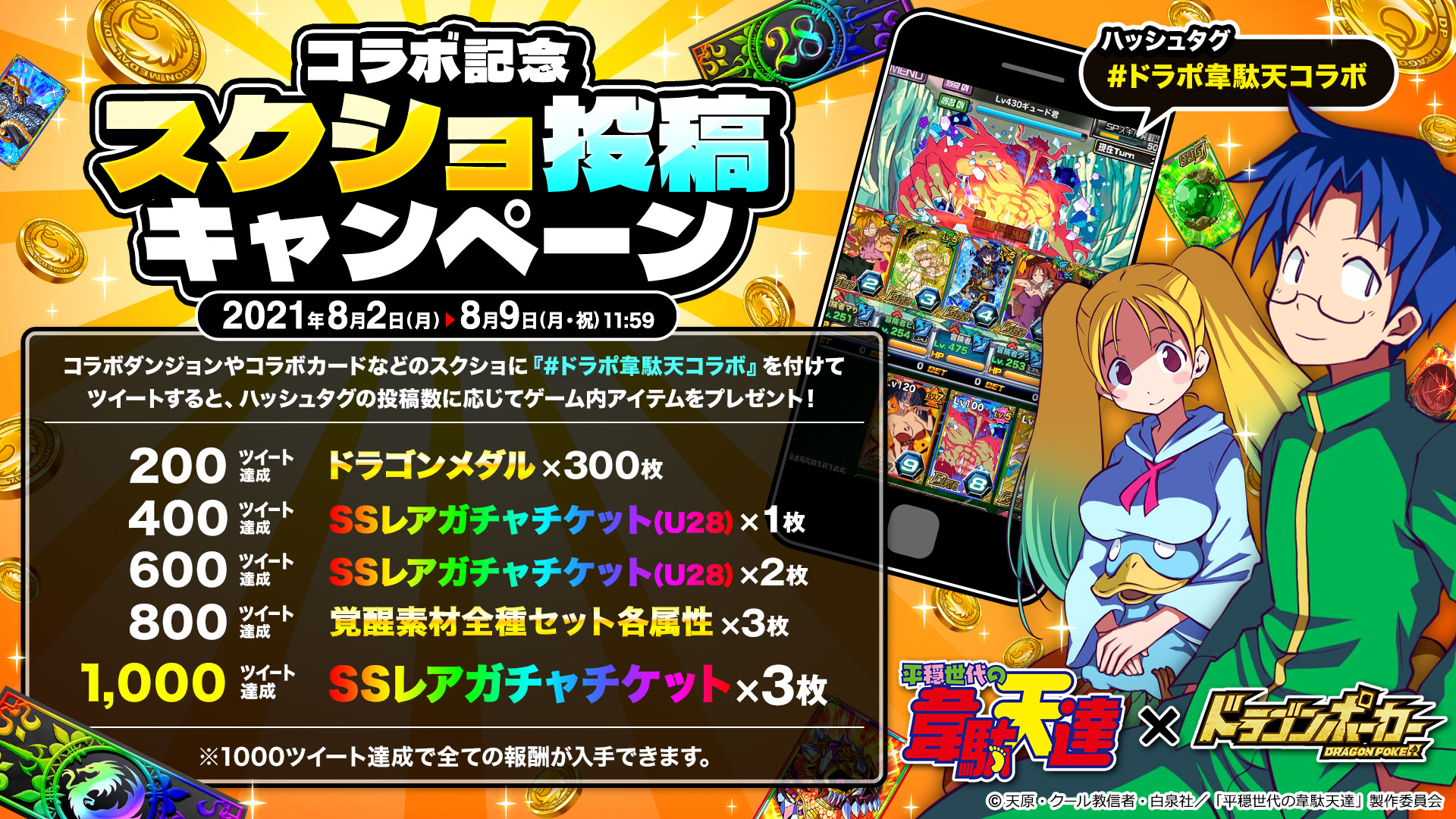 期間中、コラボダンジョンやコラボカードなどのスクショに『#ドラポ韋駄天コラボ』を付けてツイートすると、ハッシュタグの投稿数に応じて「SSレアガチャチケット」などのゲーム内アイテムをプレゼント!
