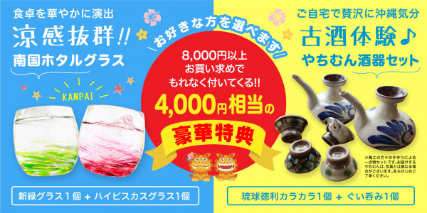ご購入特典:8,000円以上お買い求めのお客様に4,000円相当の「南国ホタルグラス」セットか「やちむん酒器」セットをプレゼント