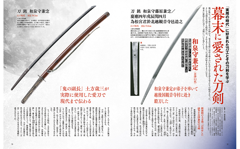 加州清光をはじめ、和泉守兼定(新選組の土方歳三)、陸奥守吉行(坂本龍馬)など、幕末の志士・剣客たちが好んで用いた刀の全貌を探る特集。