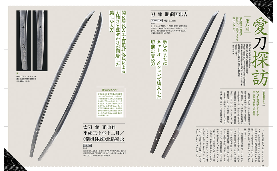 さらに、読者の個人所有刀を拝見して掲載する人気連載「愛刀探訪」も。