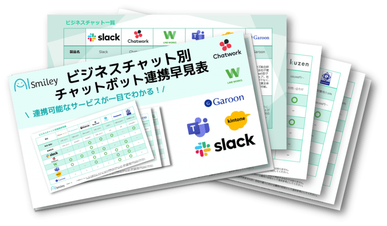 ビジネスチャット別AIチャットボット連携早見表をお求めの企業担当者様は、以下お問い合わせフォームに必要事項記入の上、お問い合わせ内容欄に「チャットボット連携早見表」と記載し送信ください。