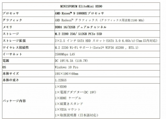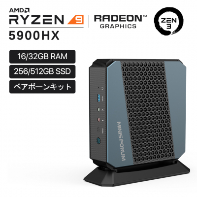 EliteMini HX90(https://store.minisforum.jp/products/minisforum-elitemini-hx90)は、2021年1月に新発表された「Zen 3」アーキテクチャを使用したAMD Ryzen 9 5900HXを搭載、内蔵AMD Radeon グラフィックス、高いCPU性能を持ち、あらゆるなシーンに対応できる高性能ミニPCです。
