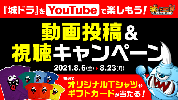 2021年8月6日(金) より、期間中YouTubeにて『城とドラゴン』に関係する動画を投稿、または対象の動画を視聴した方に、抽選でオリジナルグッズやギフトコードなどが当たる『城ドラ』をYouTubeで楽しもう!動画投稿&視聴キャンペーンを開催いたします。また、投稿された動画の一部は、後日『城とドラゴン』YouTube公式チャンネル内の「城ドラ大好き倶楽部」にて紹介。紹介された動画の投稿者には、城ドラオリジナルTシャツも進呈させていただきます。この機会にぜひ、YouTubeでも城ドラを楽しみましょう!