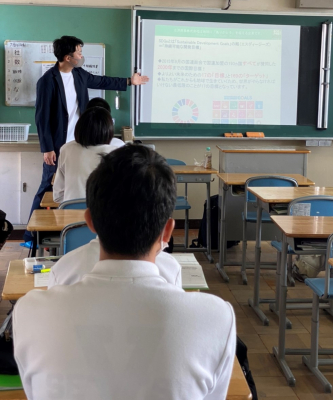 この職種体験プログラムを担当したのは、当社が約1年前に立ち上げた新部署「地球環境・未来創造部」の初代部長石田公希(26歳)です。第1回目の授業では、当社が手掛ける産業廃棄物中間処理業の事業内容を、中学生にも理解しやすくかみ砕いて説明した上で、SDGsや環境問題などの社会的課題についてレクチャーしました。また、石田が生徒と年齢が近いということで、中学生が職業を選択する際の参考になったり、将来への不安に対して勇気を与えたりできる内容を加えてほしいとの依頼も含まれていました。そこで石田は、自身の仕事内容に加え、「地球環境・未来創造部」創設のいきさつや、現職に就いた経緯、環境問題に興味を持った中学生時代のことや、生きるということ、夢についてなどをフランクに話しました。石田はこの授業を通じて、生徒が当社の事業内容や社会貢献活動、企業理念への理解だけにとどまらず、普段接することのない“社会人”と触れる機会の創出により、大人と子どもが立場を超えたフラットな関係性で思いを話し合い、将来の夢や職業について考えるきっかけ作りの一役を担うことができればと考えています。