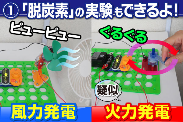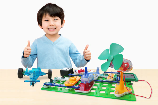 カラフルなブロックパーツをパチパチつなぐだけで、太陽光・風力・水力などの「再生可能エネルギー」による発電が体験でき、作った電気で電子回路が動かせます。