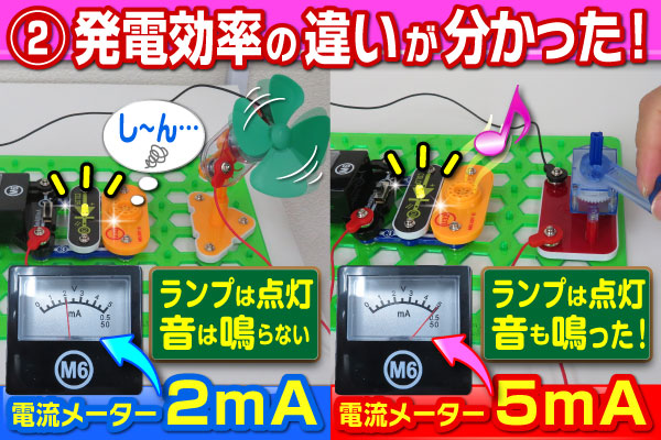 上記の実験から分かることは、風力よりもギアモーターの方が発電効率が良いということですが、それは「発電機を回す力の差」によって生じていることが分かります。