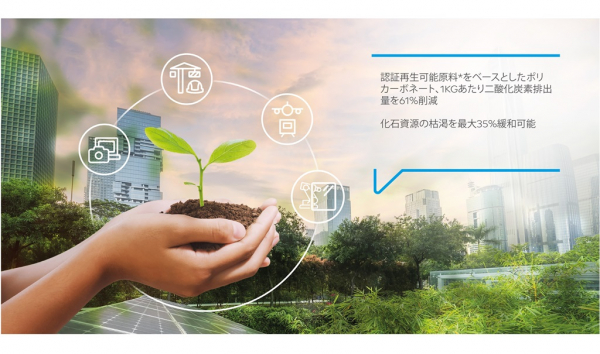 さらにSABICでは、ライフサイクル分析(LCA)を実施し、生体炭素測定に関するPAS* 2050方法論に従い、「Cradle to Gate(原料入手から製品出荷までの二酸化炭素排出量)」および「Cradle to Gate + end-of-life(寿命の終わり)」を対象に、従来の化石ベースのルートと比較した再生可能ルートの環境性能を評価した。その結果、認証再生可能原料をベースとしたSABICのポリカーボネート樹脂1kgにつき、化石資源の枯渇を最大35%緩和するとともに、二酸化炭素排出量を最大60%削減できる可能性のあることが示された。これは、気候変動に及ぼす自社製品の影響を低減しようとするSABICの取り組みにも大きく貢献するものである。