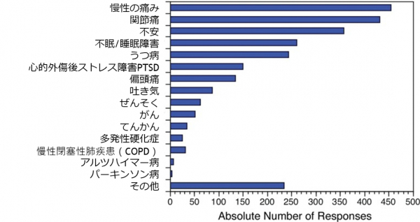 昨今、わが国においてもオイル、カプセル、クリーム、電子タバコ、飲料、グミなどのCBD製品が流通しています。海外でのCBD製品の使用者調査によると、慢性の痛み、関節痛、不安、睡眠障害、うつ病、心的外傷後ストレス障害(PTSD)、偏頭痛、吐き気、ぜんそく等に効果があった報告されています(下図参照)。