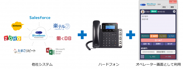 他社システムとBlueBeanを連携し、ハードフォン(IP電話機)をご利用する場合は、「オペレーター画面として利用」が便利です。電話の操作はハードフォンで行っていただき、受付や休憩操作をBlueBeanClientで行っていただくことで、オペレーターの実績がレポートに反映されます。