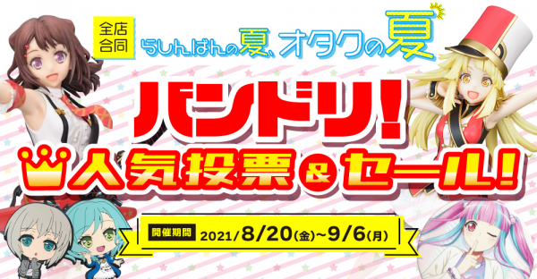 国内外に50店舗以上の中古アニメショップらしんばん(https://www.lashinbang.com)を展開する株式会社らしんばん(本部:東京都豊島区、代表取締役:宇野広輝)は、2021年8月20日(金)より、「バンドリ!人気投票&セール(https://www.lashinbang.com/news/3858/)」を実施いたします。