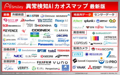 ※このカオスマップは異常検知AI提供企業のプレスリリースや製品オフィシャルサイト、導入実績などの公開情報を基にAIsmiley編集部が独自の主点で取りまとめたもので、網羅性や正確性を完全に担保するものではありません。