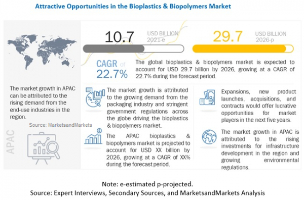 MarketsandMarketsは発表資料において、世界のバイオプラスチックとバイオポリマーの合計市場は2021年中に107億ドル、2026年には2021年から2026年までのCAGRで22.7%となる297億ドル規模になるとの予測結果を公開しました。新興国における人口増加と急速な都市化に加え、エンドユース産業からの需要が拡大していることで、バイオプラスチックとバイオポリマーメーカーにとっては重要な成長機会となることが予想されています。