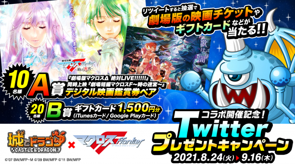 8月24日(火)より、コラボ開催を記念した「コラボ開催記念!Twitterプレゼントキャンペーン」を実施いたします。『城とドラゴン』公式Twitterアカウントをフォローし、対象ツイートをリツイートしていただいた方の中から抽選で、『劇場版マクロスΔ 絶対LIVE!!!!!!』同時上映『劇場短編マクロスF~時の迷宮~』デジタル映画鑑賞券ペアチケットや、ギフトカード1,500円分をプレゼントいたします。